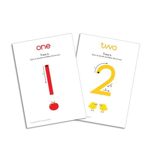 These number formation cards help children learn how to form their numbers correctly. Each number shows the starting point, and arrow prompts guide the rest of the number formation. The child can practise by tracing each number on the card with a whiteboard marker. You can erase the traced number using a damp cloth. The cards are A5 sized, durable and wipeable. There are 11 cards in the set, featuring the numbers 0 to 10. A whiteboard marker and cloth are not included.